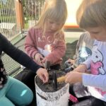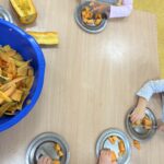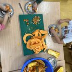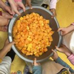 Ob svetovnem dnevu hrane, ki ga obeležujemo 16. oktobra smo z otroki iz jedilnih buč, ki so nam jih prinesli otroci, pripravili slastno bučno juho s pomočjo naših kuharic. V tednu otroka smo se preizkusili v zabijanju žebljev, trenju orehov, spoznali smo igro »gumitvist« ter zraven povabili tudi veveričko Muki, da se je preizkusila v skakanju. V jesenski raziskovalnici pa nadaljujemo z raziskovanjem drevesnih listov…